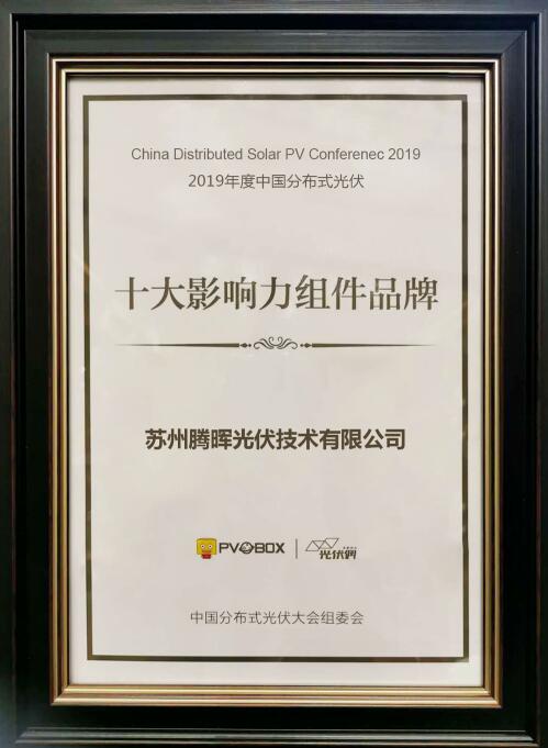 2020年7月2日,第三屆中國分布式光伏大會在山東濟南成功舉辦。騰暉光伏憑借自己高功率、高質(zhì)量、高發(fā)電量的組件產(chǎn)品、全球領(lǐng)先的光伏電站開發(fā)實力、在中國分布式光伏市場上的不斷專注投入及“光伏+”模式應用上的不斷創(chuàng)新和應用,斬獲“2019年度中國分布式光伏十大影響組件品牌”大獎。這也是騰暉光伏繼2017年、2018年獲獎之后,第三次獲此殊榮。