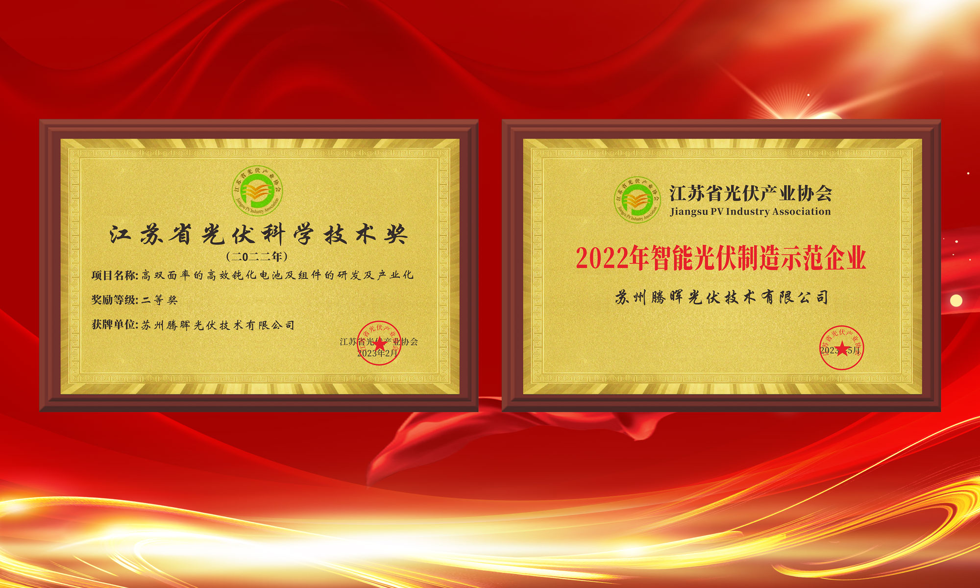 2023年5月9日,騰暉光伏受邀出席江蘇省光伏產(chǎn)業(yè)協(xié)會(huì)第四屆會(huì)員大會(huì)暨光伏行業(yè)智改數(shù)轉(zhuǎn)論壇,并獲“2022年智能光伏制造示范企業(yè)”及“江蘇省光伏科學(xué)技術(shù)獎(jiǎng)”二等獎(jiǎng)兩項(xiàng)殊榮!