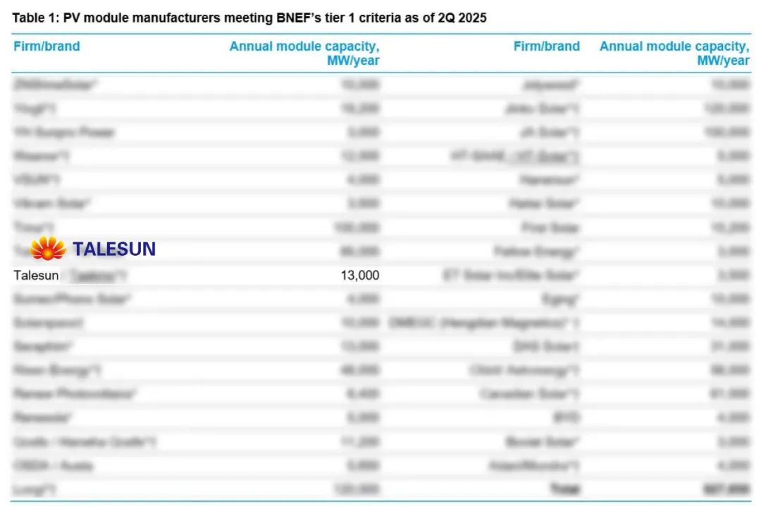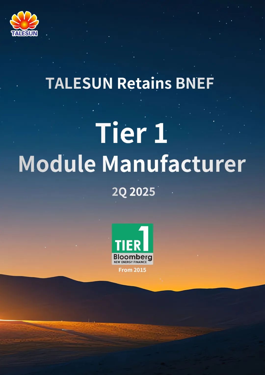 Global authoritative research institution BloombergNEF officially announced the Q2 2025 Tier 1 Global PV Module Manufacturer List. Amid intensifying industry competition and stringent new regulatory pressures, Talesun Solar has once again secured its position on the list,?becoming one of the few PV enterprises to maintain inclusion under the updated rules. This achievement not only reaffirms Talesun Solar’s industry leadership but also highlights its exceptional comprehensive competitiveness under high barriers and rigorous standards.